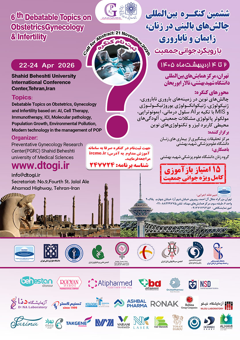 تعويق زمان برگزاري كنگره قابل توجه شرکت کنندگان محترم در ششمین کنگره بین المللی چالش های بالینی در زنان،زایمان و ناباروری زمان برگزاری کنگره به تاریخ 2 الی 4 اردیبهشت ماه 1405 در همان مکان موکول شد.
